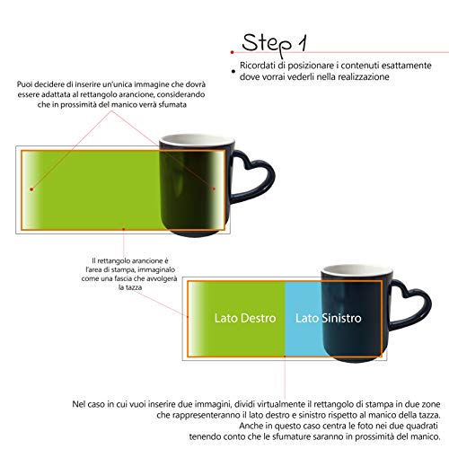 Confezione risparmio da 12 tazze personalizzate magiche in ceramica termosensibile da 325ml, con manico a CUORE, personalizzabili con tecnica sublimatica. L'immagine stampata a Tazza personalizzata fredda è coperta da un sottile velo nero semi-trasparente che lascia solo intravedere l'immagine sottostante, la stampa appare quando viene versata una bevanda calda, il velo nero torna quando la Tazza personalizzata si raffredda. Stupisci i tuoi amici !!!!!