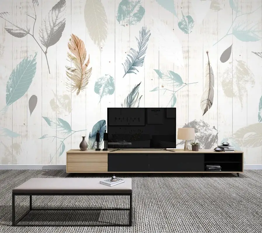 Customized 3D Wallpaper 8D Mural Nordic Plant Leaf Feather Modern Simple Wooden Board Wood Grain TV Background Wall