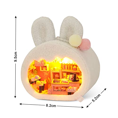 【Design Unico】Kit casetta da dessert Cuteebun Bunny, dimensione finita 8,2 * 5,5 * 9,5 cm, utilizzando una scala in miniatura di circa 1:24. Mobili e accessori sono quasi gli stessi delle case reali, i materiali sono simili, inclusi letti, finestre, tende, scrivanie, librerie, piante, ecc., creando un caldo mondo in miniatura. L'aspetto del coniglio è carino e unico.