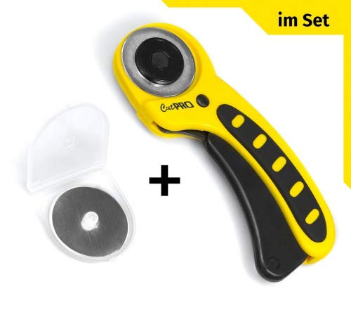 Cutpro - Taglierina premium + 1 confezione di sicurezza con lame di ricambio - Lama rivestita con rullo di sicurezza, cutter per tessuti con dispositivo di bloccaggio e fermo