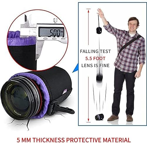 Buona protezione dei materiali: il neoprene elastico da 5 mm offre la migliore protezione per l'obiettivo della fotocamera. Il robusto corpo in neoprene evita danni quando l'obiettivo cade accidentalmente e protegge da umidità, sabbia, polvere, acqua, urti accidentali o graffi.