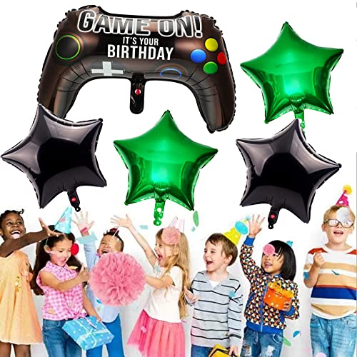 Set di palloncini per videogiochi: 1 palloncino da gamepad, 2 palloncini a forma di stella verdi, 2 palloncini a stella neri, 2 palloncini con numeri.