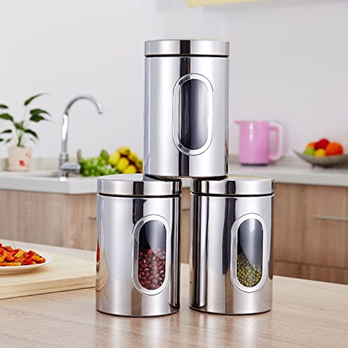 Cyrank Set di 3 vasetti per la conservazione degli alimenti, barattolo per spezie in acciaio inossidabile con finestra trasparente Contenitori per la conservazione della cucina Contenitore(D'argento)