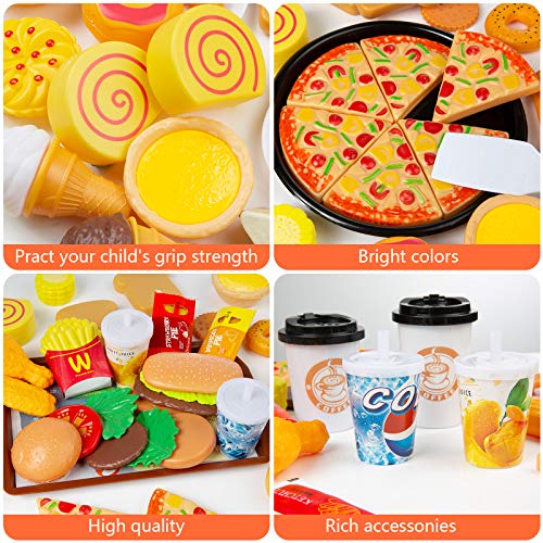 Il set di cibo da gioco contiene 56 pezzi di modello di cibo come hamburger, patatine fritte, gelato, tacchino, biscotti, ecc. Avere molte specie, i bambini possono contattare diversi tipi di cibo stimolando così la curiosità dei bambini