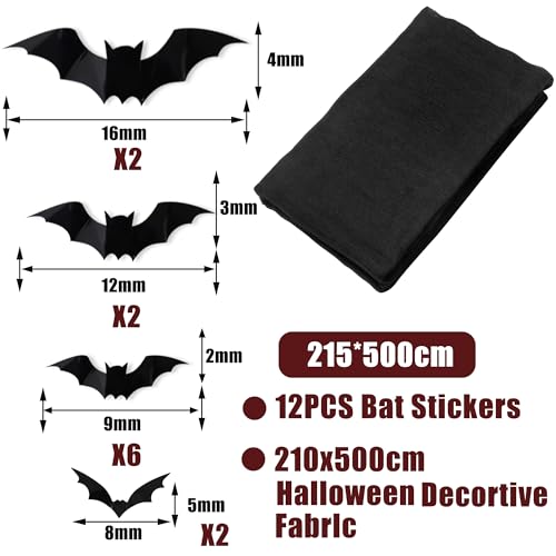 Großes Halloween schwarzes Gruseltuch:Die Größe dieser Halloween Gruselgaze ist 200 x 800 cm, groß genug, um ein Fenster zu bedecken und das gruselige Netztuch von der Decke zu drapieren. Dieses übergroße gruselige Tuch kann als hervorragende Kulisse für jede Halloween Party verwendet werden  Du erhältst: 1-teilige 3D Aufkleber für fliegende Fledermäuse und 1-teilige schwarze Gruselgaze 215X800CM