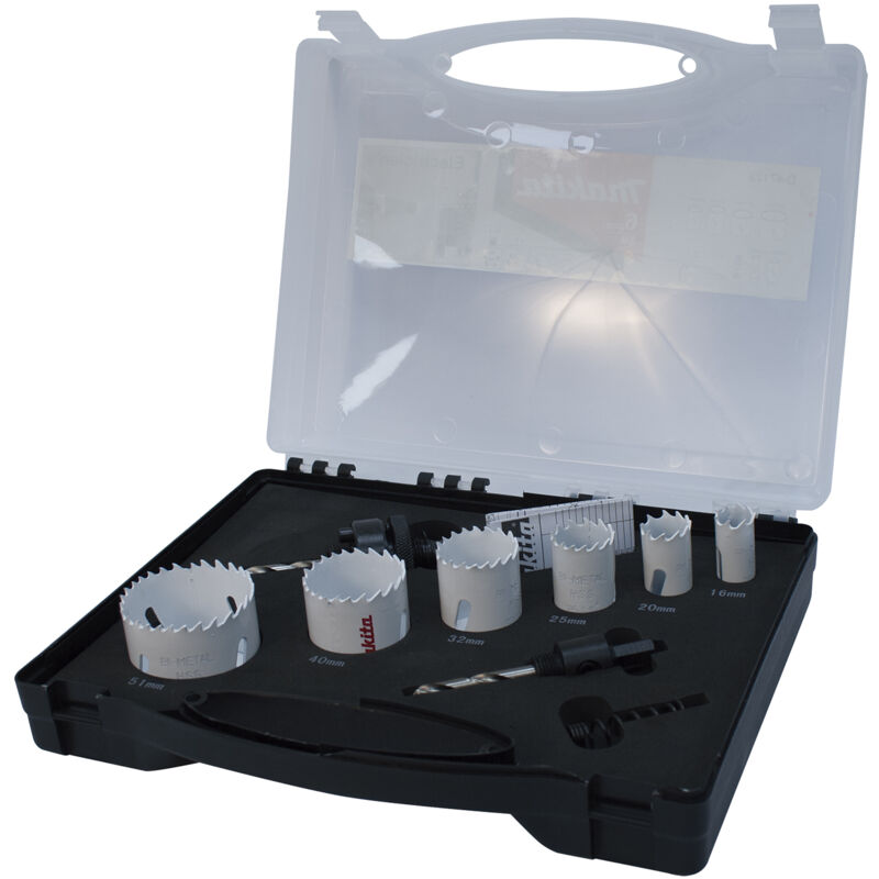 MAKITA D-47123 Custodia di punte a corona bimetalliche 6 pezzi Elettricità 16,20,25,32,40,51mm + 2 adattatori. Compatibilità < /strong> Descrizione - Elettricità Diametro - 16,20,25,32,40,51 - mm