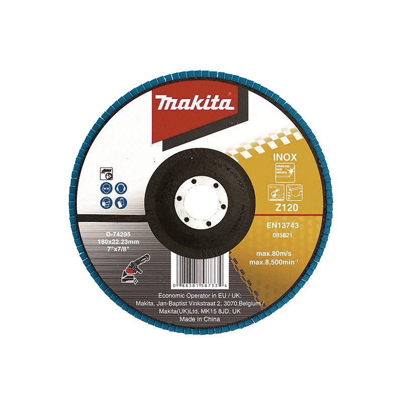 MAKITA D-74295 Disco lamellare 180 (G120) metallico Disco con abrasivo allo zirconio. Compatibilità Grana - 120< /p >Descrizione - Acciaio inossidabile e metallo Diametro - 180 - mm Diametro interno - 22,23 - mm