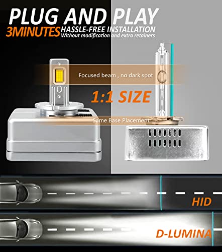 【Luminosità aumentata del 600%】D-Lumina chip LED personalizzati integrati con illuminazione bianca diamante da 6500 K e 90W per lampadina. La luminosità della lampadina dei fari a led D5S è più luminosa del 600% rispetto a quella dei fari nascosti originali per darti la migliore visibilità durante la guida.