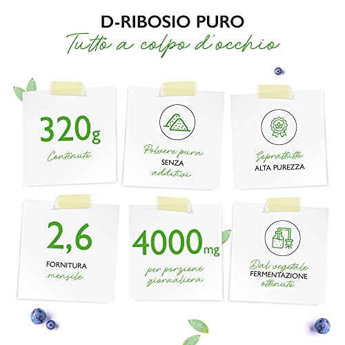 OTTIMO PREZZO PERFORMANCE: D-Ribosio in polvere ad alto dosaggio e completamente naturale in un sacchetto richiudibile da 320 g. 80 porzioni giornaliere di 4000 mg ciascuna, sufficienti per 2,6 mesi. Il misurino incluso rende facile dosare la polvere di Ribose.
