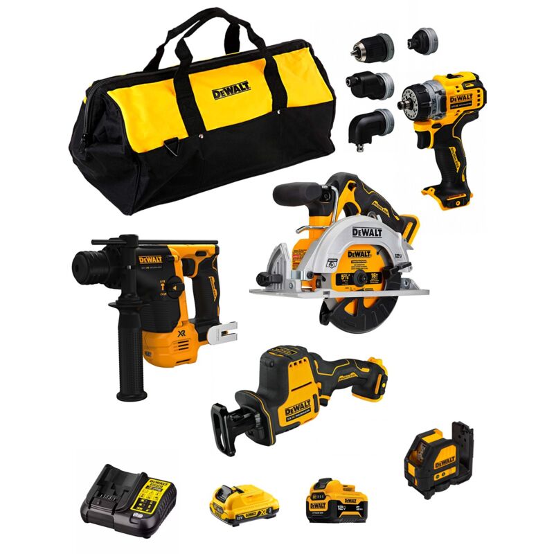DeWALT Kit D12K503 Sega Circolare DeWALT DCS512 - Motore brushless per maggiore autonomia, maggiori prestazioni e durata - Leva di regolazione dell'angolo di taglio fino a 50° - Modulo elettronico che riconosce la batteria e fornisce maggiore potenza all'utensile - Interruttore di sicurezza per avviamento e freno elettronico per un buon controllo dell'utensile e una maggiore sicurezza per l'utente - Soffiatore integrato per pulire la linea di taglio - Strumento molto ben bilanciato, buona presa - Design molto robusto, suola in alluminio pressofuso che garantisce durata e precisione - Impugnatura secondaria per un migliore controllo e un uso sicuro a due mani - Compatibile con il sistema Airlock di DeWALT per un collegamento rapido e sicuro al tubo dell'aspirapolvere - Lampada a LED per illuminare la linea di taglio e il piano di lavoro - Gancio che offre maggiore portabilità e versatilità sul posto di lavoro Mini-Sega Universale DeWALT DCS312 - Sega Universale compatta per accedere