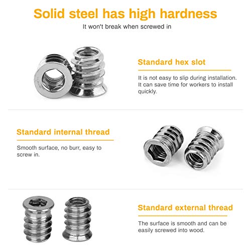 【Dimensione precisa】 120 pezzi Kit di assortimento di dadi con inserto filettato ad esagono incassato di alta precisione. Profondità di avvitamento: 17mm, Foratura - Ø: 12.7 mm, Filettatura interna: M8, Testa - Ø: 13.72mm.Suggerimenti: La dimensione del foro può essere opportunamente ridotta o allargata in base alla durezza del legno.