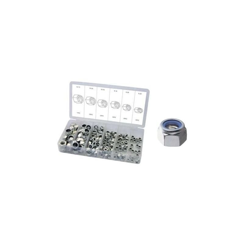 Assortimento di 195 dadi in acciaio autobloccanti con inserto in nylon. Forniti in astuccio in plastica, in 6 diverse misure.