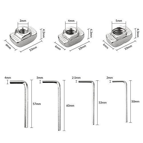 Set di dadi a T M3 M4 M5 (180 pezzi) in acciaio al carbonio nichelato, kit per profilo in alluminio serie 2020, kit di dadi per estrusore, testa martello, per stampante, 3D con 4 chiavi a brugola
