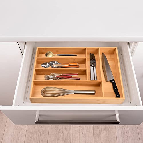 Daelesr Portaposate da Cassetto, Organizer per Posate Color Legno con 6 Scomparti, 43 x 30 x 6 cm Vassoio Portaposate in Bambù, Scatola Portaposate Legno per Cassetti da Cucina