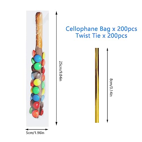 DAGORD 200 pezzi Sacchetti Trasparenti 25x5cm Sacchetti di Cellophane OPP Bustine Cellophane Piccole Sacchetti in Plastica con 200 Cravatte Dorato per Caramelle Gommose Confetti Biscotti Regali
