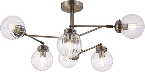 Daisy Lampadario Moderno, 6 Luci, Metallo bronzato, Paralumi Sfera in Vetro rigato soffiato trasparente, Diametro 74 cm, Design asimmetrico, per 6 lampadine E14 40W non incl.