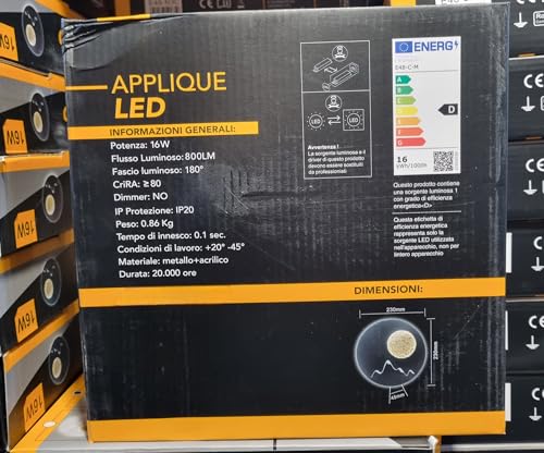 I led integrati hanno un'alta efficienza luminosa con un'intensità di 800 lumen L' applique è dotato di rosetta con staffa per il fissaggio a parete. L'accensione è immediata L'applique ha emissione di luce con fascio luminoso 180°