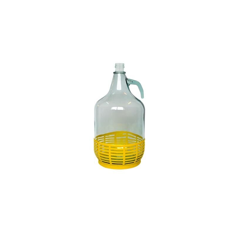 Dame in vetro con cestino In vetro, 5 Lt. con manico, imbocco per tappo a vite 35x15 (non in dotazione) con base rivestita in plastica. Indicata per il trasporto e la conservazione di liquidi alimentari