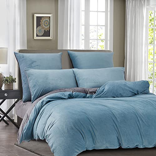 Damier Biancheria da letto invernale in peluche, 200 x 220 cm, colore turchese, blu, grigio, set da 3 pezzi, 1 copripiumino con chiusura lampo e 2 federe da 80 x 80 cm