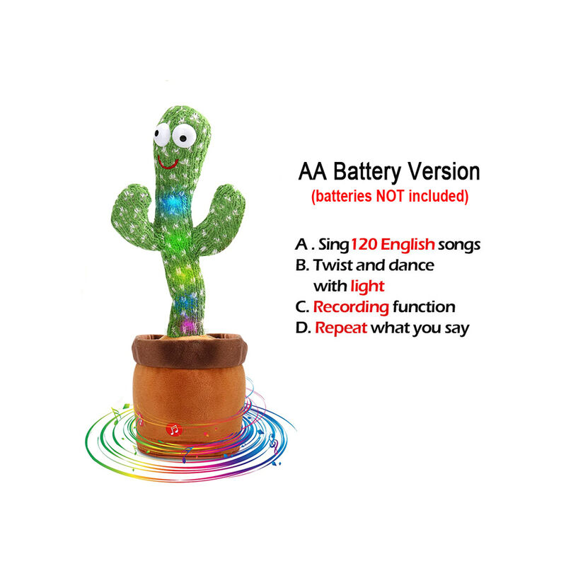 Dancing Cactus 120 Song Speaker Talking Voice Repeat wrigle Dancing Sing Toy Talk Plushie peluche per regalo di natale per adulti per bambini A proposito di questo articolo: Bilanciacoversioneciciaeciabicalcatore danzante divertente aggiornato ripeti quello che dici. Questa versione che include funzioni di registrazione, ripetizione, incandescente, danza e canto. Ci sono 120 canzoni in molte lingue che possono cantare. Può registrare ciò che dici e ripeti le tue parole. Caricare le batterie e premere il pulsante. Attorciglierà il suo corpo e si illumina durante il canto. È davvero divertente, quindi prova a parlare sommething con esso, che ti dà assolutamente un umore felice.Artil materiale di alta qualitàefieci4: questo prodotto utilizza un tessuto morbido non tossico e innocuo, il tessuto è comodo e non causa alcun danno, i bambini possono giocare con fiducia. Il fondo del giocattolo elettronico Tik Tok cactus è in plastica, quindi può stare saldamente sul tavolo.Argivendita