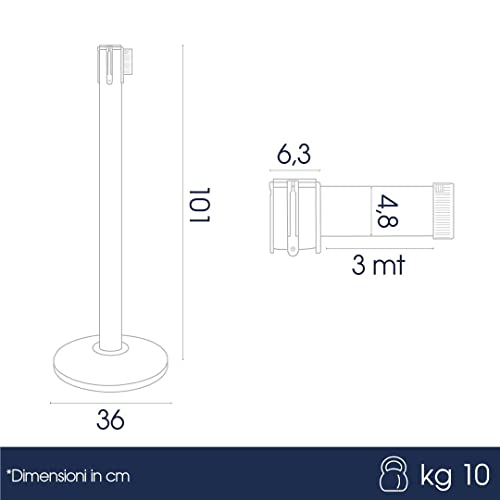 ✅ Colonna segnapercorso con finitura nera opaca, dotate di sistema tendinastro autofrenante. Altezza 1010 mm. Peso totale kg 10. Lunghezza nastro 3 m con clip di sicurezza.