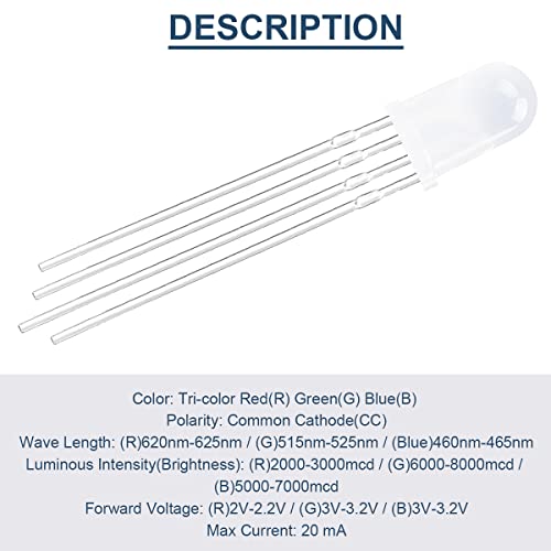 DAOKAI 100Pack 5mm LED Light Emitting Diode Catodo Comune DC 3V 20mA RGB Tri-Color (Rosso/Verde/Blu) 4Pin Smerigliato Rotondo Diffuso Lampade LED Buld Componenti elettronici per Arduino