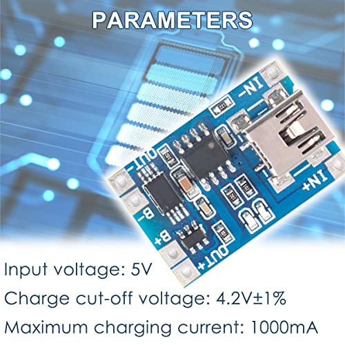 ⚡ [Parametri del modulo] Tensione di ingresso: 5 V, Tensione di interruzione della carica: 4,2 V ± 1%, Corrente di carica: 1000 mA (max), Tensione di protezione da sovraccarico della batteria: 2,5 V, Corrente di protezione da sovracorrente della batteria: 3 A.