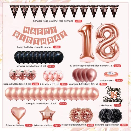 【Decorazioni 18 anni Compleanno】Include 1 palloncino in lamina d'oro numero 18 in oro rosa da 32 pollici, 22 gagliardetti in oro rosa, 1 striscione di buon compleanno in oro rosa, 1 topper per torta, 4 fiori in lamina d'oro rosa nera, 4 oro rosa da 12 pollici palloncini, 15 palloncini in lattice oro rosa da 12 pollici, 10 palloncini in lattice nero da 12 pollici, 6 palloncini coriandoli oro rosa da 12 pollici, 1 palloncino stella foil da 18 pollici, 1 palloncini foil di cuore da 18 pollici.