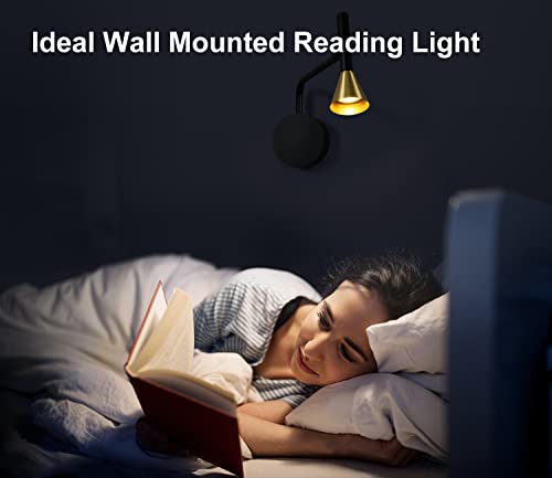 DAWALIGHT Lampada da Lettura da Parete 6W LED 450LM Luce da Lettura Dimmerabile 3000K Bianco caldo Lampada da Comodino da Parete per Letto Lettura Divano Poltrona Hotel Interno, Ottone e Nero