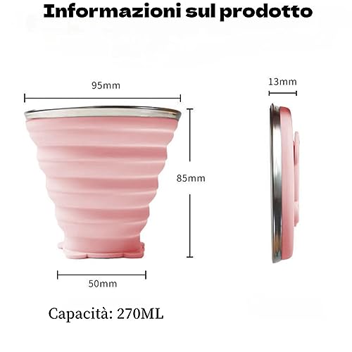 【Qualità superiore】 Il nostro bicchiere pieghevole è realizzato con materiali di alta qualità selezionati appositamente. Il silicone alimentare di grado premium garantisce un'esperienza di utilizzo sicura e piacevole, in quanto è facile da pulire, non tossico, privo di odori sgradevoli, resistente alle macchie e all'usura. Inoltre, il bordo in acciaio inossidabile conferisce al bicchiere una presa salda e comoda. Potrai utilizzarlo con tranquillità.