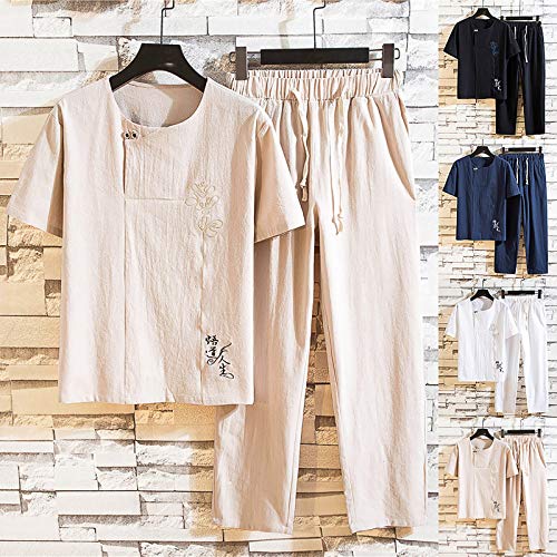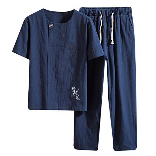 DAY8 Tute Uomo Estive Cotone E Lino Tuta Uomo Sportiva Completa Estiva Casual Taglie Forti Elegante Leggero Manica Corta Maglietta + Pantaloni Set Sport Abbigliamento (marino, 5XL)