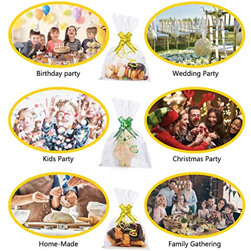 【Set regalo pratico】 La confezione include 100 pezzi di sacchetti trasparenti regalo e 100 pezzi di nastri in diversi colori. Perfetto per regali sulla porta, feste di compleanno, San Valentino, Natale e Halloween