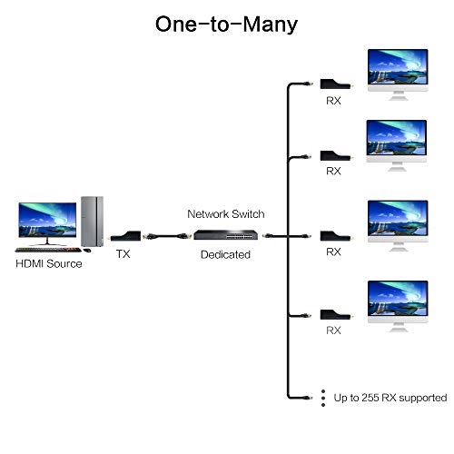 CONNESSIONE DA UNO A MOLTI: combinando questo extender HDMI su IP con ricevitori aggiuntivi (fino a 253RX) e uno switch dedicato non gestito, è possibile distribuire facilmente una sorgente HDMI a più postazioni e creare pareti video con più display e ricevitori remoti nella stessa posizione.