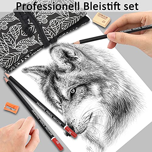 Set di matite professionali da schizzo: include 1 temperamatite, 1 gomma da cancellare, 1 rotolo di penna, 12 matite affilate di qualità professionale (10B, 8B, 6B, 5B, 2x4B, 3B, 2x2B, HB, 2H, 3H). Una vasta gamma di durezza per tutte le vostre esigenze grafiche. Adatto per varie tecniche di disegno, schizzi e scrittura.
