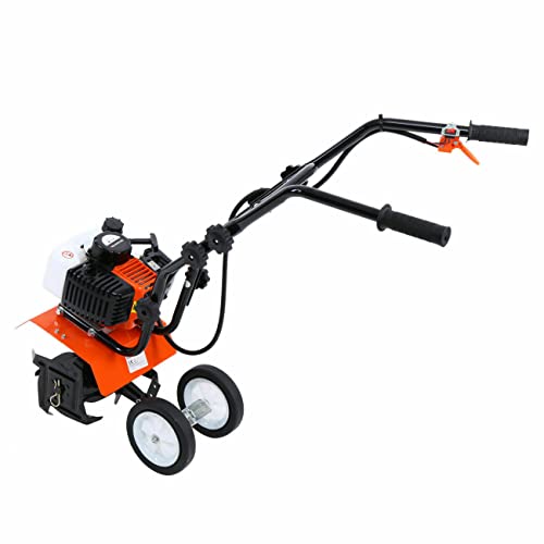 Caratteristiche: dotato di un motore a benzina da 52 cc con una capacità del serbatoio di 1,2 L e una velocità massima di 9000 giri/min, e di 4 potenti ruote dentate per coltivare il terreno. Puoi facilmente capovolgere una terra molto dura con questo leggero strumento da giardinaggio a benzina.