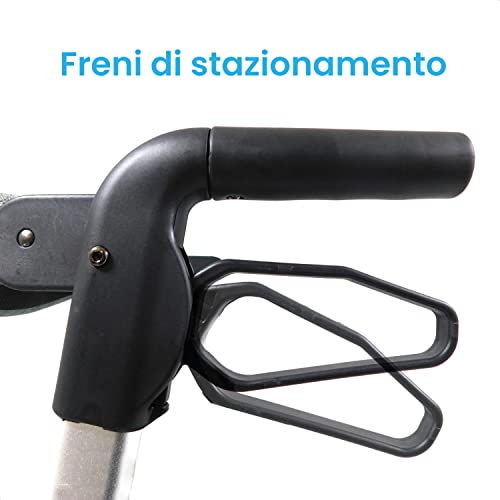 BLOCCAGGIO: per immobilizzare completamente il deambulatore rollator, tirare le leve dei freni verso il basso e le ruote saranno bloccate.