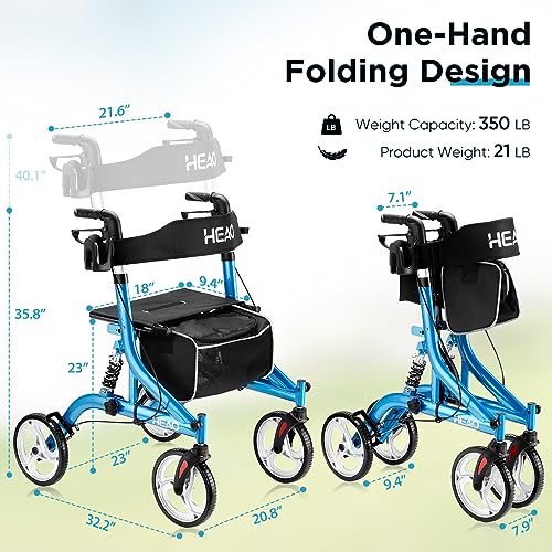 Deambulatore rollator HEAO con sedile, Adatto per anziani, 4 ruote da 25,4 cm con ammortizzatori, Leggero solo 9 kg, Caricabile fino a 159 kg, Leggero con maggiore mobilità, Altezza regolabile, Blu