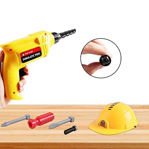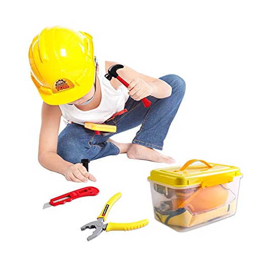 DeAO Kit di Attrezzi e Scatola Portatile Giocattolo da 33 Pezzi per Bambini Include Trapano, Casco, Gilet e Altri Accessori.