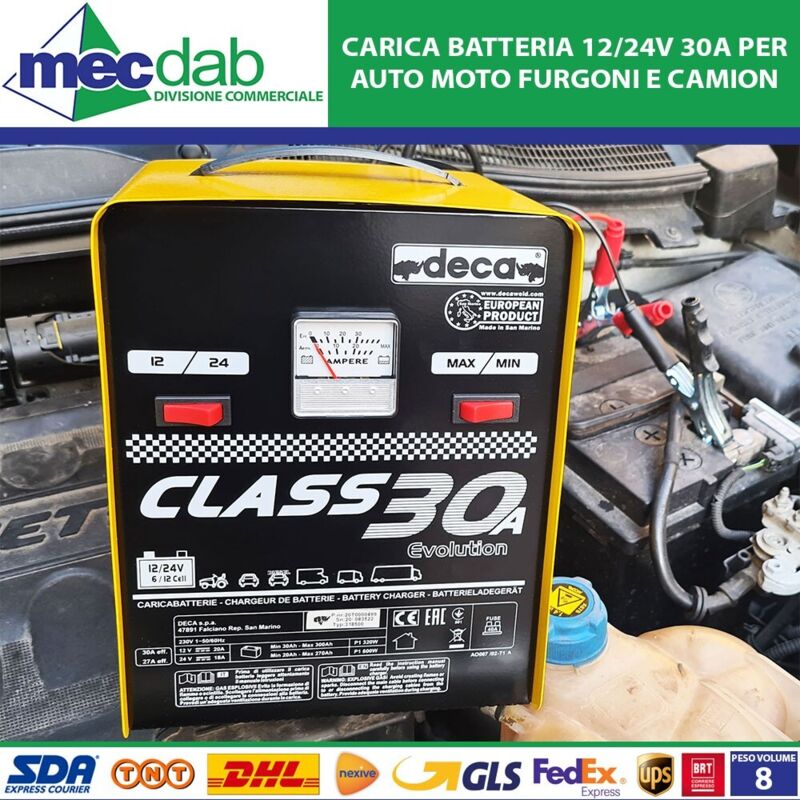 Alimentazione 230 Volt, potenza 350 Watt, tensione di carica 12/24 Volt, 2 posizioni di carica, corrente di carica 30 Amp. con regolazione della corrente di ricarica e protezione contro le inversioni di polaritÃÂ e contro i corto circuiti alle pinze