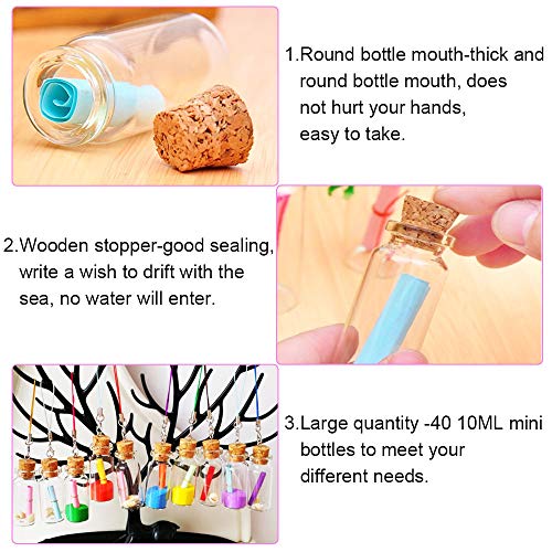 ★【Misure e Quantità】Set di 40 Pezzi Mini Boccette di Vetro, 15mm x 5mm (circa 10 ml), una quantità abbondante può soddisfare le varie esigenze, vetro trasparente con tappo in sughero per fai-da-te per bottiglie artigianali. Sono anche adatti per pendenti intercambiabili, messaggi in una bottiglia, pendenti souvenir e molto altro.