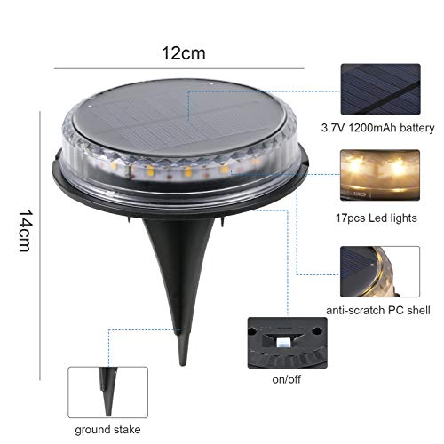 【LAMPADE SOLARE A TERRA A 17 LED】Ogni luce è composta da 17 perline di luce bianca calda, più luminose delle altre luci a disco solare, offrendo una scena abbagliante al buio,È molto adatto per giardini, cortili, marciapiedi, sentieri, terrazze, campeggi, ecc.
