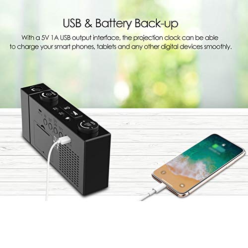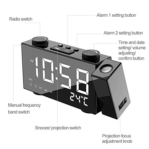 Decdeal Sveglia con Proiettore - Radiosveglia da Comodino Digitale,4 Luminosità di Display/3 Luminosità di Proiezione/2 Sveglie/Funzione Snooze e Termometro/USB Porta/Rotante a 180 °