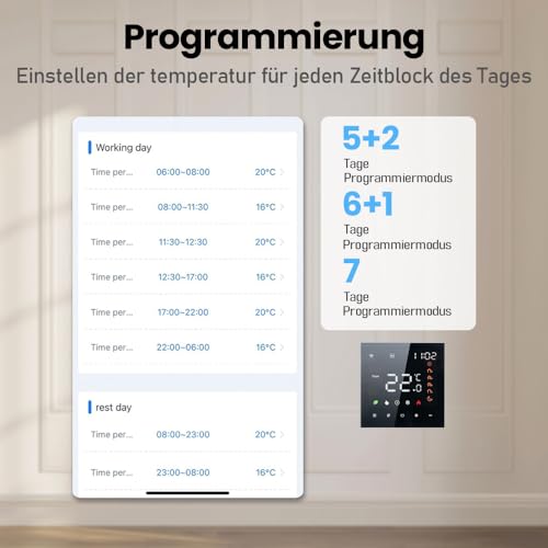 Questo termostato Wi-Fi ha una funzione di programmazione 5+2/6+1, che consente di impostare fino a 6 diverse impostazioni di temperatura per ogni giorno della settimana e un'impostazione aggiuntiva per il fine settimana.