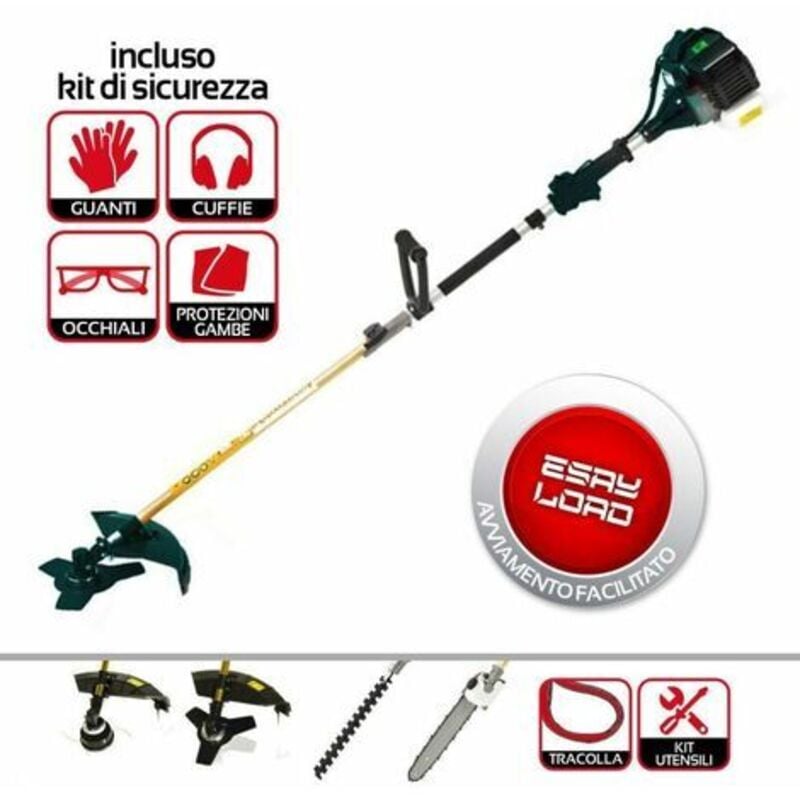 DECESPUGLIATORE TAGLIAERBA MULTIFUNZIONE 4IN1 MULTIFLEX SAN MARCO DECESPUGLIATORE 52 CC PER SIEPI E GIARDINO PER FAI DA TE CON TAGLIASIEPI, TAGLIAERBA, POTATORE, MOTOSEGA, CON EASY START Il decespugliatore professionale Multiflex della San Marco 4in1 è un vero tuttofare. La confezione Infatti include un decespugliatore, un tagliasiepi, un potatore e tosasiepi tutto in un unico dispositivo. Questo strumento versatile per il giardino è una macchina robusta e facile da usare, per vari lavori nel settore forestale, così come nel giardinaggio e nel paesaggio. Ha un motore a due tempi affidabile e potente con 52 ccm, non è mai stato così facile utilizzare una macchina così versatile per uso hobbistico. Per rendere ancora più piacevole il vostro lavoro, inseriamo insieme agli altri attrezzi per decespugliatore: un kit sicurezza, composto da occhiali protettivi, paraorecchi, guanti e 2 parastinchi (utili per prevenire di sporcarsi). SPECIFICHE TECNICHE DEL DECESPUGLIATORE MULTIFUNZIONE SAN