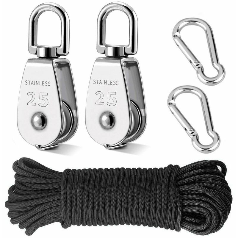 Contenuto della confezione: puleggia singola M25 × 2, ganci a scatto M8 × 2, fune per puleggia in nylon da 6 mm 20 m. Limite di carico singolo 160 kg / 330 LB. Buona qualità: resistenza alla ruggine e all'usura e struttura robusta. Superficie trattata ad impatto, il cui materiale principale è l'acciaio inossidabile 304. Puleggia: design ergonomico, piastra fissa per una facile movimentazione della fune, rullo liscio per una buona traversata della fune, solido giogo di rotazione della puleggia, durevole, rotazione di 360 gradi per evitare che la fune si annodi. Corda: corda solida in polipropilene intrecciato, 66 piedi - estremamente resistente con alta tenacità. Moschettone: hardware versatile per fissaggio, incastro e ancoraggio: aggancio/sgancio rapido di corde, catene, cinghie.