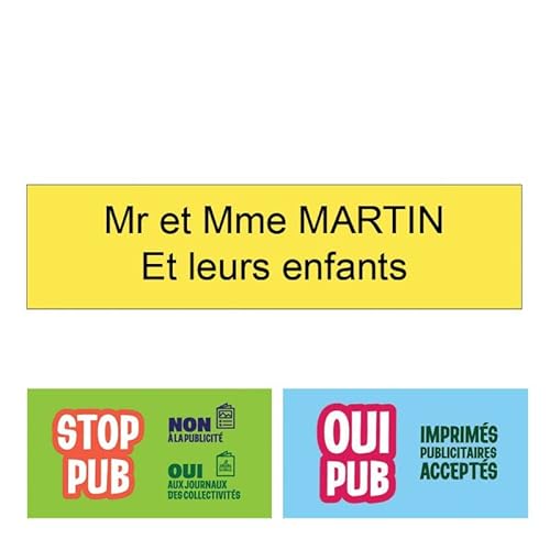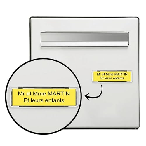 Targhetta per cassetta delle lettere personalizzata in formato 100 x 25 mm, colore giallo scrittura nera. 2 righe di testo, scelta di 12 font.