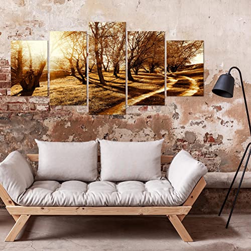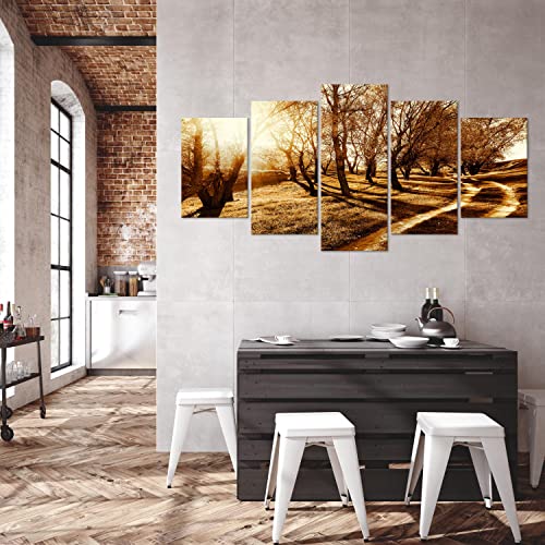 Decomonkey Quadro Stampa su Tela moderno Bosco 200x100 cm 5 pezzi Murale Fotografia Immagini Decorazione da parete Grafica Natura Parco Paesaggio Prato Albero Sole Foglie Sepia beige