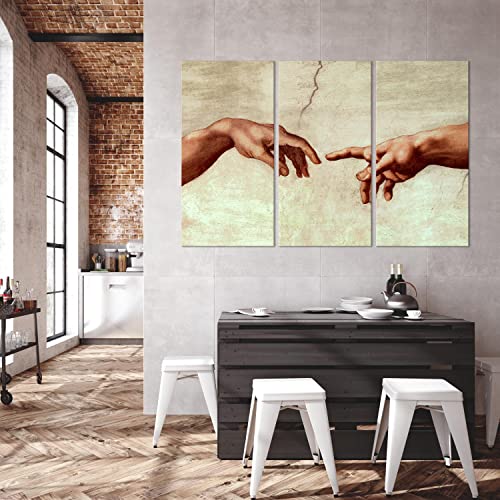 Decomonkey Quadro Stampa su Tela moderno Creazione di Adamo 135x90 cm 3 pezzi Murale Fotografia Immagini Decorazione da parete Grafica Riproduzione Michelangelo Buonarroti Marmo Mani Pietra beige