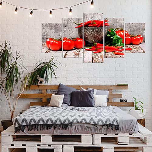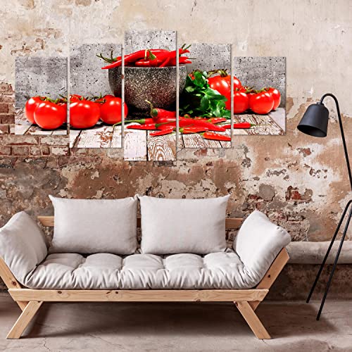 Decomonkey Quadro Stampa su Tela moderno Cucina Verdure 200x100 cm 5 pezzi Murale Fotografia Immagini Decorazione da parete Grafica Natura Legno Pomodori Peperoni rosso beige bianco