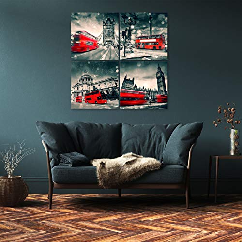 Decomonkey Quadro Stampa su Tela moderno London Set di 4 pezzi 20x20 cm Murale Fotografia Immagini Decorazione da parete Grafica Londra City Architettura UK Autobus Tower Bridge bianco nero rosso